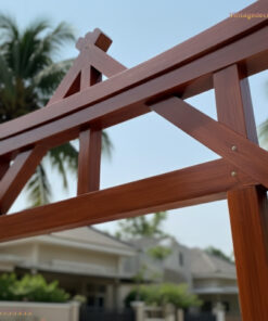 Điểm nhấn lớn nhất của C36 là cấu trúc phần mái và trụ. Với các thanh gỗ thông bản lớn được cắt vát tinh xảo, phần mái tạo hình vòng cung nhẹ nhàng, kết hợp với các thanh giằng chéo tăng cường độ chịu lực và tạo chiều sâu thị giác. Hệ trụ đôi đặc trưng không chỉ giúp cổng đứng vững trước gió bão mà còn tạo nên vẻ ngoài bề thế, uy nghi. Các chi tiết liên kết được tính toán tỉ mỉ, đảm bảo tính kỹ thuật và thẩm mỹ cao nhất.