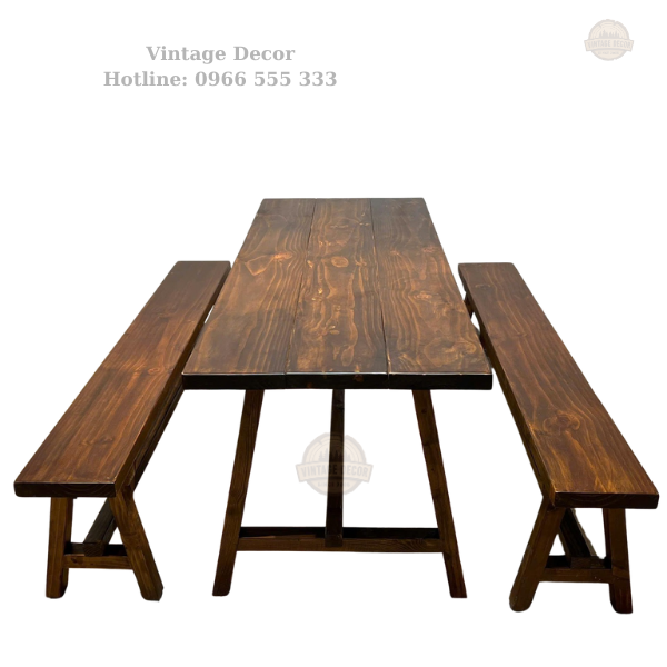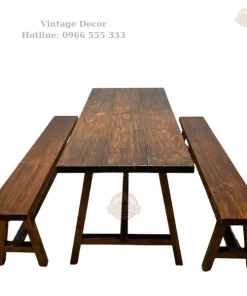 Bộ sản phẩm gồm 1 bàn dài và 2 ghế băng, được chế tác từ gỗ tự nhiên cao cấp với lớp sơn phủ chống thấm, giúp giữ nguyên vẻ đẹp vân gỗ tự nhiên đồng thời bảo vệ bề mặt khỏi trầy xước.
