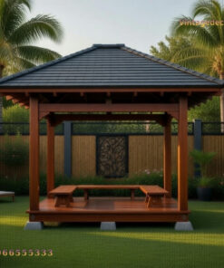 - Tiện ích nội khu: Tích hợp hệ thống ghế băng gỗ chạy dọc theo khung chòi, tối ưu hóa không gian sử dụng cho nhiều người.