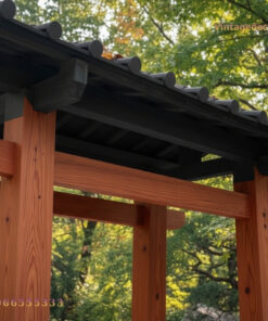 - Hệ mái ngói đẳng cấp: Phần mái được thiết kế với lớp ngói màu đen xám, xếp lớp dày dặn theo phong cách kiến trúc Nhật Bản cổ điển. Mái có độ dốc chuẩn giúp thoát nước nhanh, bảo vệ kết cấu gỗ bên dưới luôn bền đẹp.