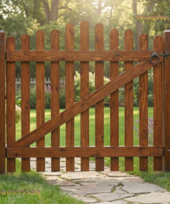 Sản phẩm sở hữu thiết kế Picket Fence cách điệu với các thanh gỗ dọc có đầu bo tròn hình cánh cung, tạo nên diện mạo mềm mại nhưng vẫn giữ được sự chắc chắn. Điểm nhấn đặc biệt là thanh chéo chịu lực giúp cánh cổng không bị xệ theo thời gian, đồng thời tạo nên nét thẩm mỹ đặc trưng của những khu vườn phong cách Châu Âu.