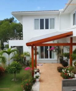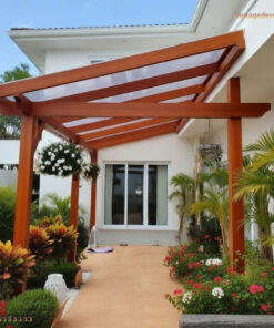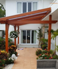 Giàn hoa Pergola P16 gây ấn tượng ngay từ cái nhìn đầu tiên bởi sự kết hợp hài hòa giữa nét mộc mạc của gỗ và sự hiện đại của vật liệu mái che.