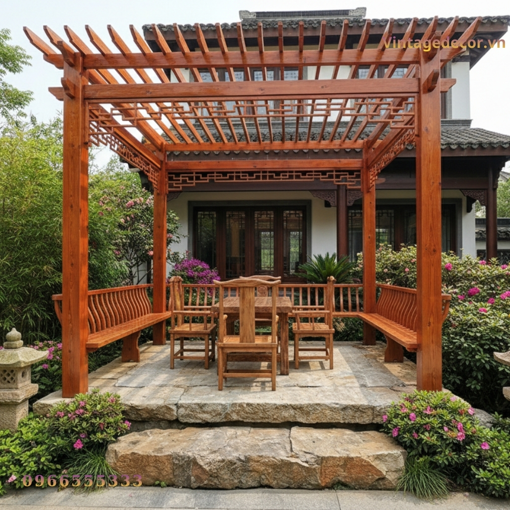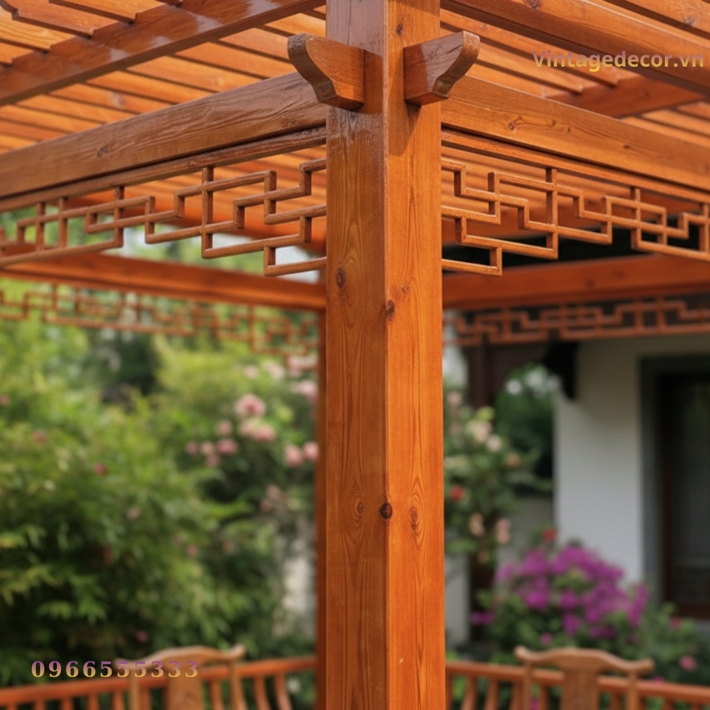 - Kết cấu: Sử dụng mộng gỗ truyền thống kết hợp phụ kiện kim loại chống gỉ, đảm bảo an toàn tuyệt đối trước mưa bão.