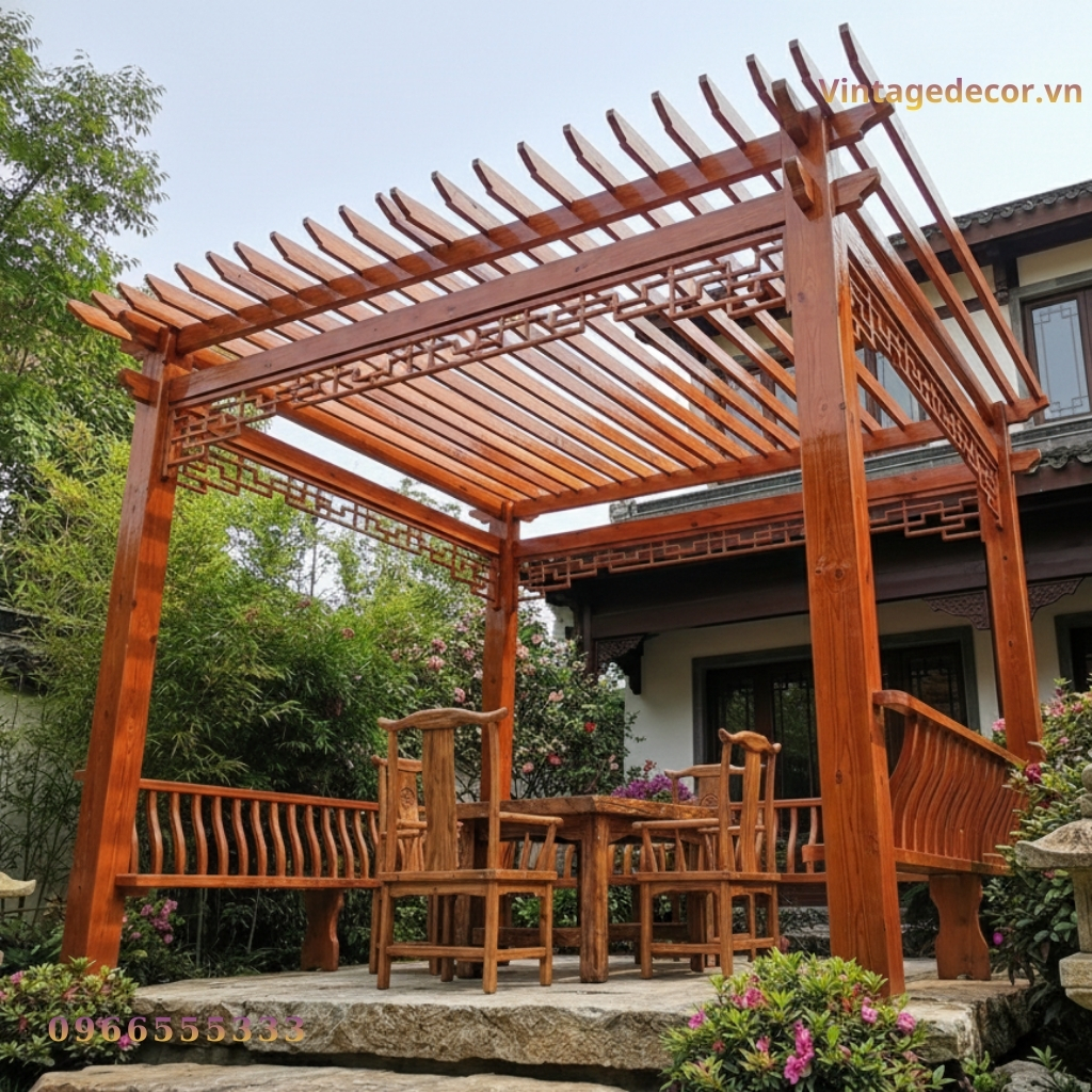 Giàn hoa Pergola gỗ chính là mảnh ghép hoàn hảo mà bạn đang tìm kiếm. Không chỉ đơn thuần là một giàn leo cho cây cối, mẫu Pergola P4 tại Vintage Decor là sự kết hợp tinh tế giữa kiến trúc châu Âu phóng khoáng và nét mộc mạc, bền bỉ của gỗ tự nhiên. Hãy cùng chúng tôi khám phá cách mà thiết kế Pergola P4 có thể “lột xác” hoàn toàn không gian sống của bạn qua bài viết dưới đây.