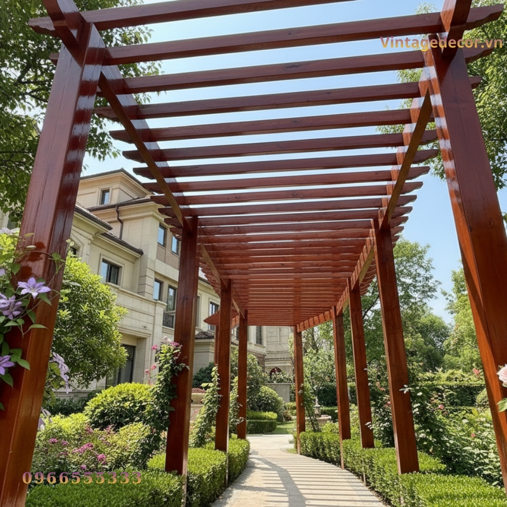 - Kết cấu vững chãi: Hệ cột trụ và xà ngang được liên kết bằng mộng âm dương kết hợp phụ kiện kim khí chống gỉ, đảm bảo khả năng chịu lực tuyệt vời. Bạn hoàn toàn có thể treo những giỏ lan nặng hay để giàn hoa hồng leo phủ kín mà không lo sập xệ.