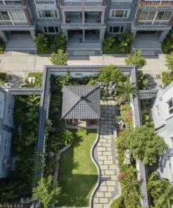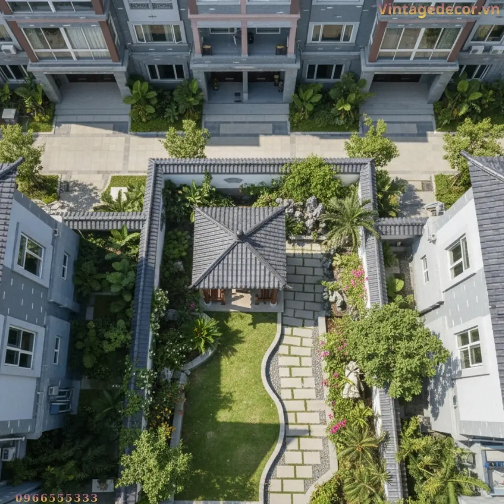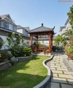 - Hệ mái ấn tượng: Phần mái được lợp ngói vảy cá hoặc ngói âm dương màu xám đen, với độ dốc vừa phải giúp thoát nước tốt và cách nhiệt hiệu quả. Bốn góc mái vút cong nhẹ nhàng tạo nên nét mềm mại, gợi nhớ đến kiến trúc đình chùa Việt xưa nhưng được cách tân để phù hợp với sân vườn hiện đại.