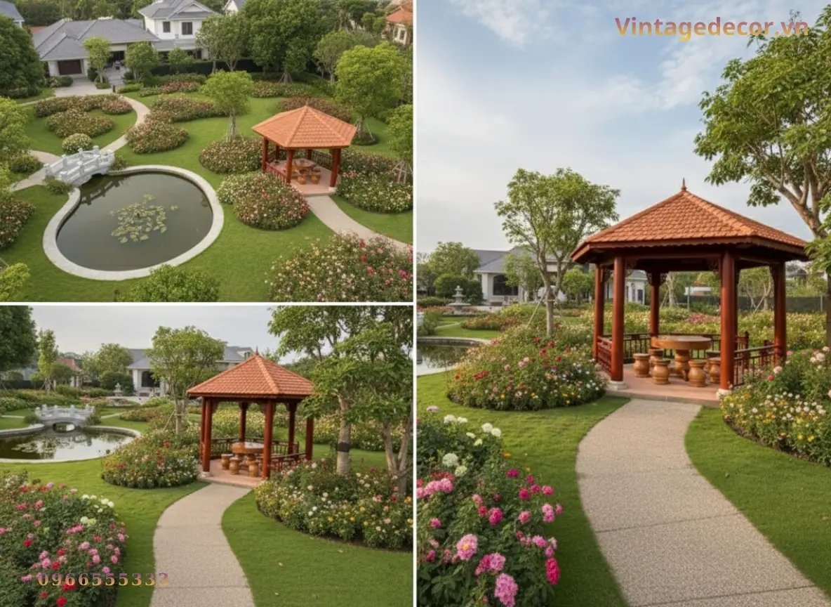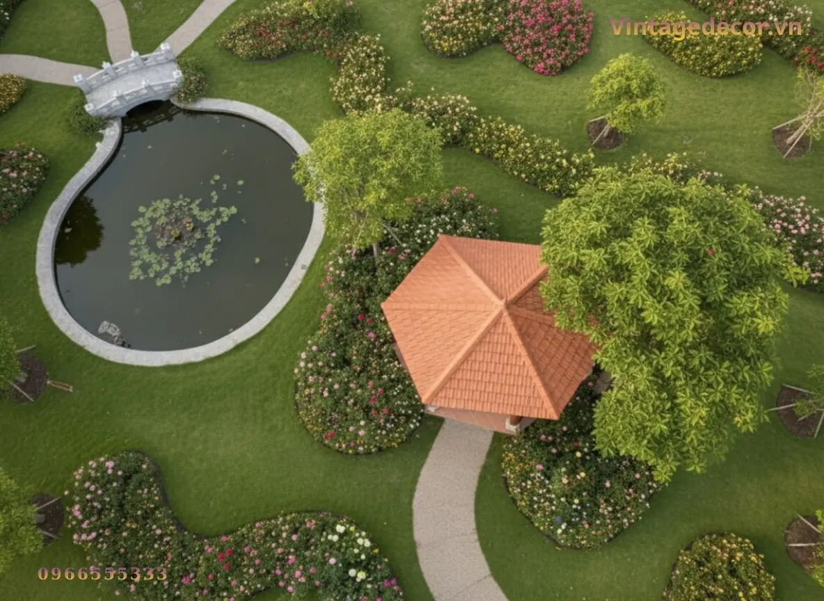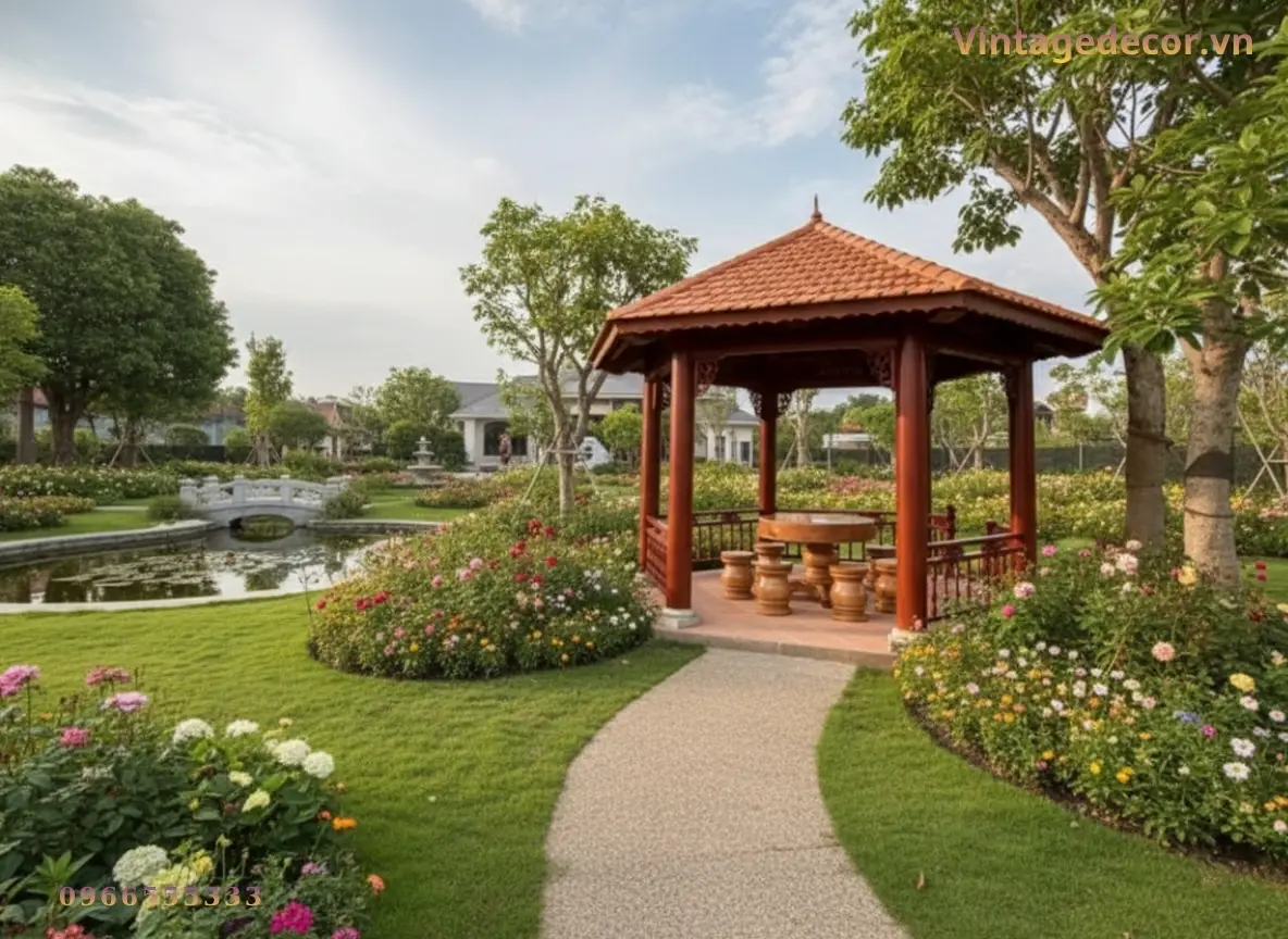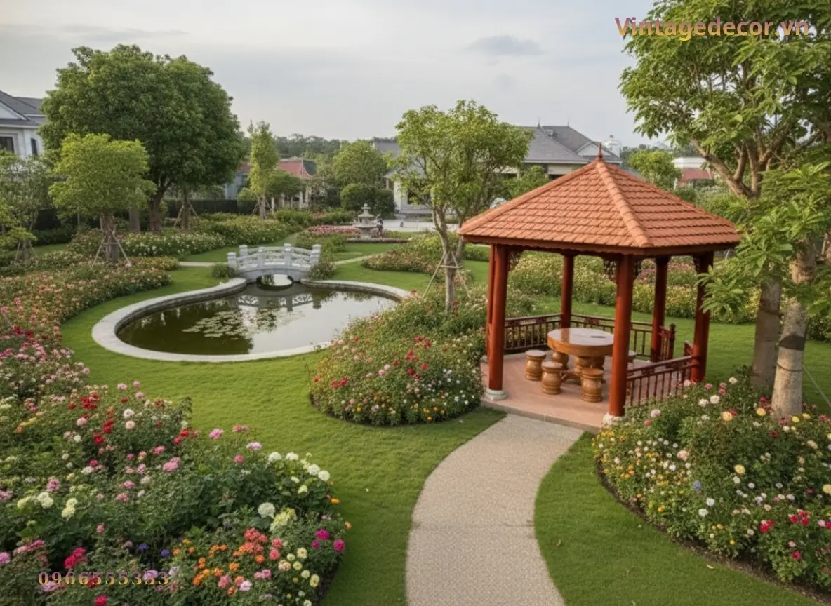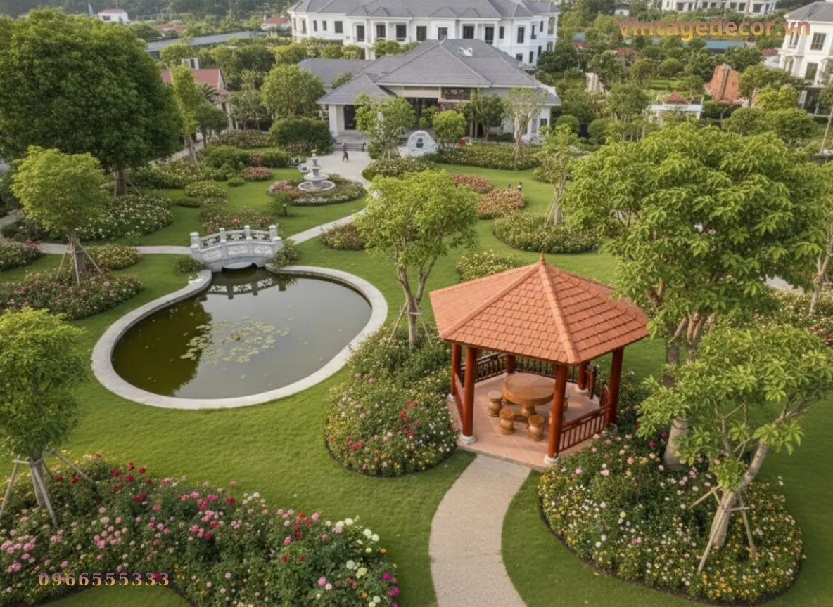 Đồng bộ cảnh quan: cung cấp thêm cầu đá, ghế đá, đèn vườn, thảm cỏ, bồn hoa theo concept.