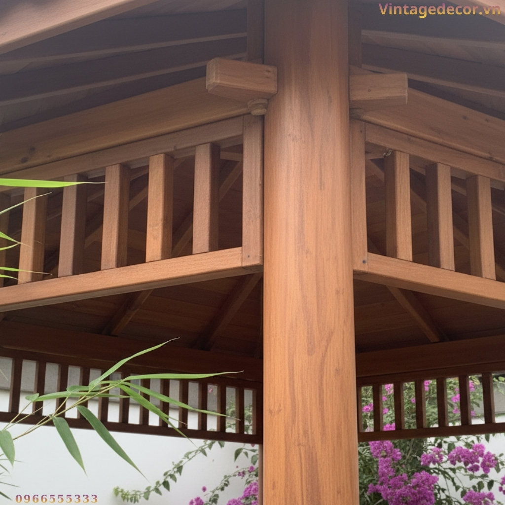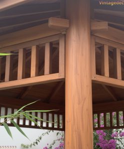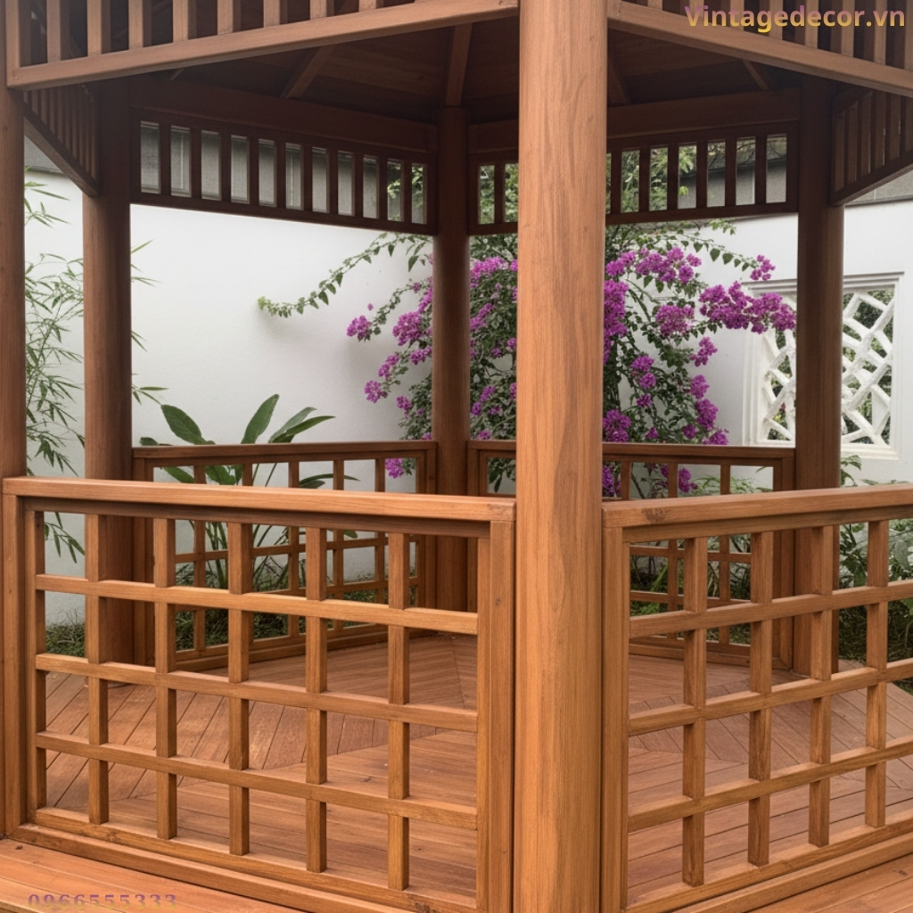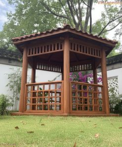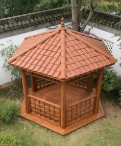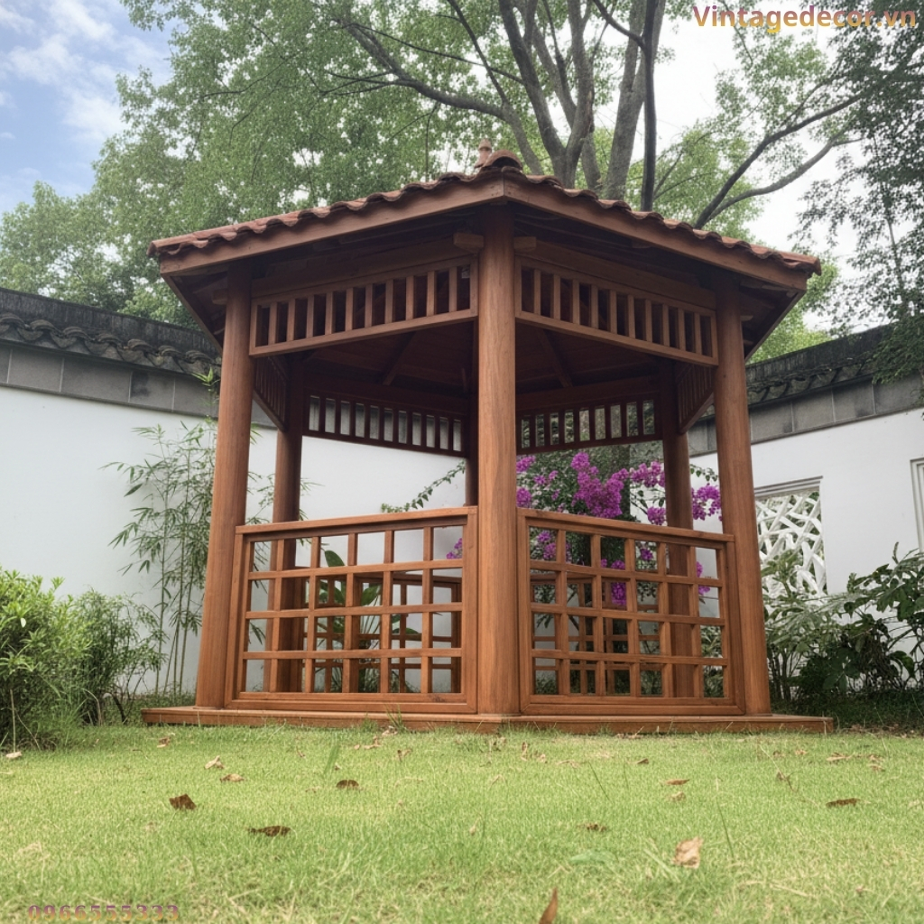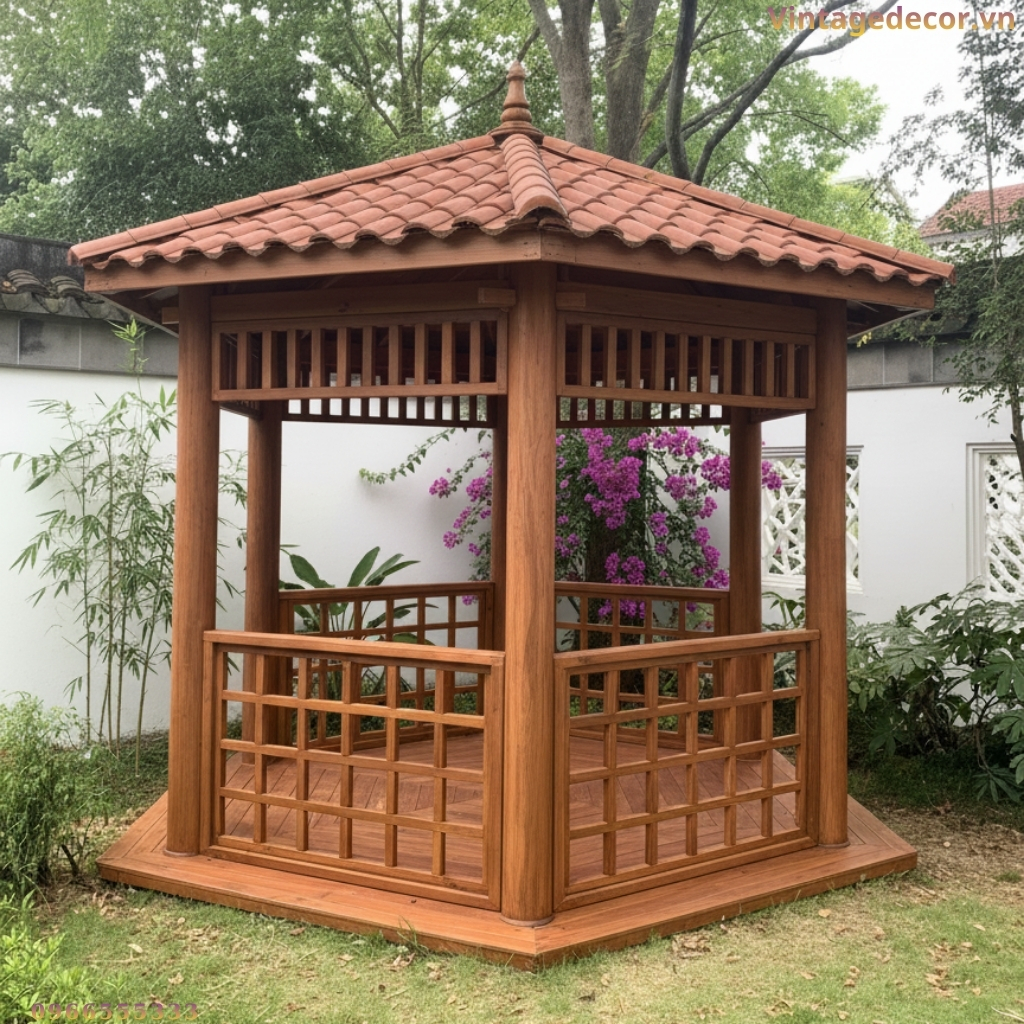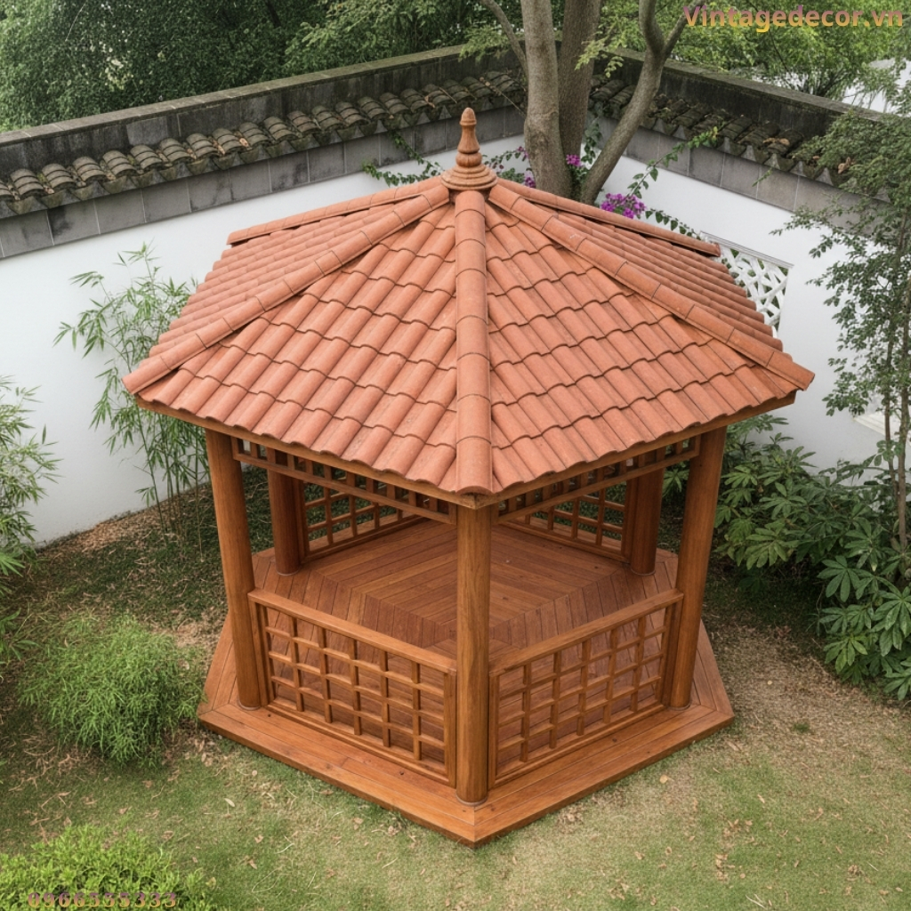Nhà chòi lục giác (hay còn gọi là lầu vọng nguyệt) từ lâu đã là hình ảnh quen thuộc trong các kiến trúc cung đình xưa hoặc các khu nghỉ dưỡng cao cấp. Kế thừa nét đẹp truyền thống đó và kết hợp với kỹ thuật thi công hiện đại, Vintage Decor trân trọng giới thiệu mẫu Nhà chòi gỗ lục giác T14 – một điểm nhấn hoàn hảo, mang lại vẻ đẹp bình yên và sang trọng cho không gian sân vườn của bạn.