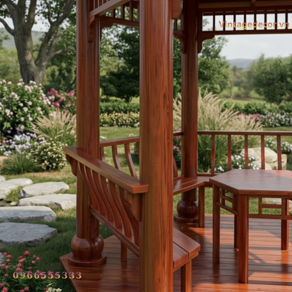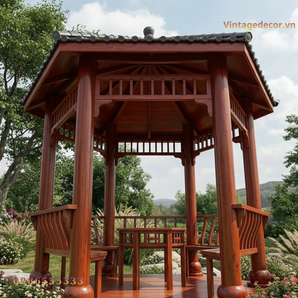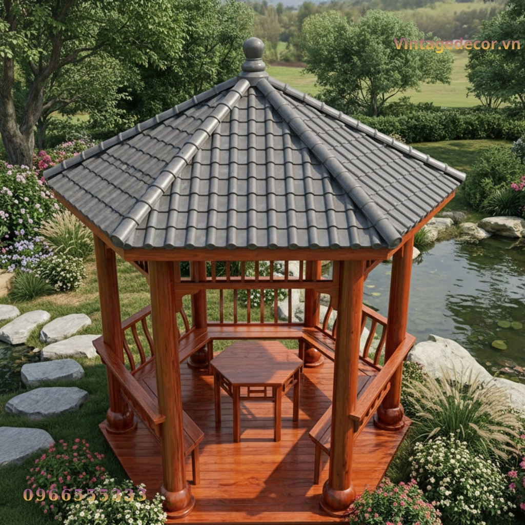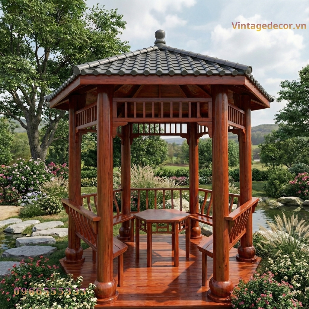 Trong xu hướng thiết kế cảnh quan sân vườn (Landscape) hiện nay, sự xuất hiện của một căn nhà chòi gỗ (Gazebo) không còn quá xa lạ. Tuy nhiên, để tìm được một thiết kế vừa giữ được nét mộc mạc, gần gũi, vừa toát lên vẻ sang trọng, tinh tế thì Nhà chòi gỗ T31 của Vintage Decor chính là câu trả lời hoàn hảo nhất.