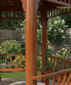 - Hệ cột trụ quyền lực: Sản phẩm sử dụng hệ thống cột gỗ lớn nguyên khối (hoặc ghép hộp kỹ thuật cao), được xử lý bo tròn hoặc vát cạnh mềm mại, tạo thế đứng vững chãi như những thân cây cổ thụ bám rễ vào đất mẹ.