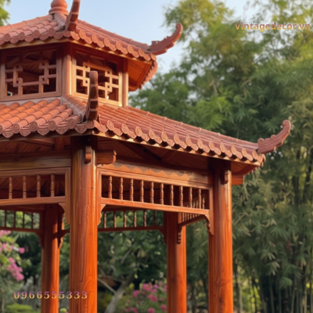 Sản phẩm sở hữu kết cấu vững chãi nhưng không hề thô kệch. Các đường nét được trau chuốt tỉ mỉ, từ hệ cột trụ chắc chắn đến phần mái được thiết kế với độ dốc tiêu chuẩn, giúp thoát nước tốt và tạo độ thoáng khí tối đa cho người ngồi bên trong.
