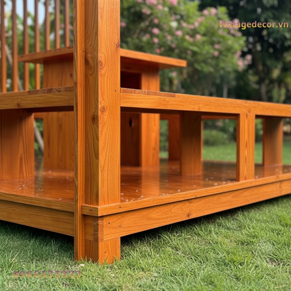 - Gia công tỉ mỉ: Từng thanh gỗ thông đều được bào nhẵn, bo cạnh sắc sảo và sơn phủ kỹ lưỡng trước khi lắp đặt.