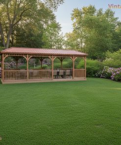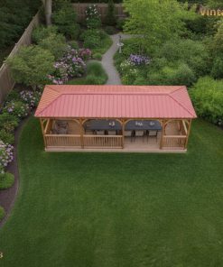 Nhà chòi A2 là mẫu chòi dài, mái tôn màu ấm, lan can gỗ thông thoáng – lý tưởng cho sân vườn rộng, biệt thự, homestay, quán cà phê sân vườn. Bố cục mở 3–4 nhịp hiên cho phép bố trí bàn ăn 6–12 ghế, khu BBQ, quầy trà… tạo một “phòng khách giữa thiên nhiên” vừa riêng tư vừa thoáng mát.