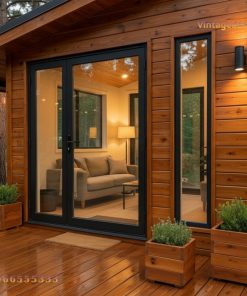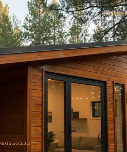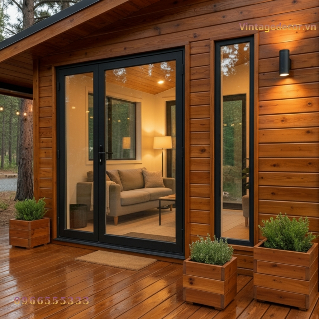 Toàn bộ mặt tiền được ốp gỗ tự nhiên với tông màu nâu trầm ấm áp, được xử lý kỹ lưỡng để lộ ra những vân gỗ tinh tế. Điểm “đắt giá” nhất của thiết kế này chính là hệ thống cửa kính cường lực khung nhôm xingfa đen bản lớn. Những ô cửa kính kịch trần không chỉ xóa nhòa ranh giới giữa trong và ngoài, mà còn biến khung cảnh thiên nhiên xung quanh – dù là rừng thông Đà Lạt hay bãi biển Phú Quốc – trở thành bức tranh trang trí sống động nhất cho căn phòng.