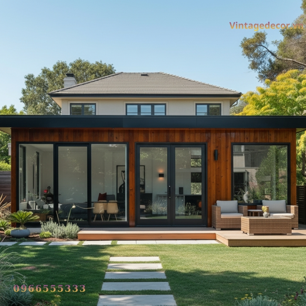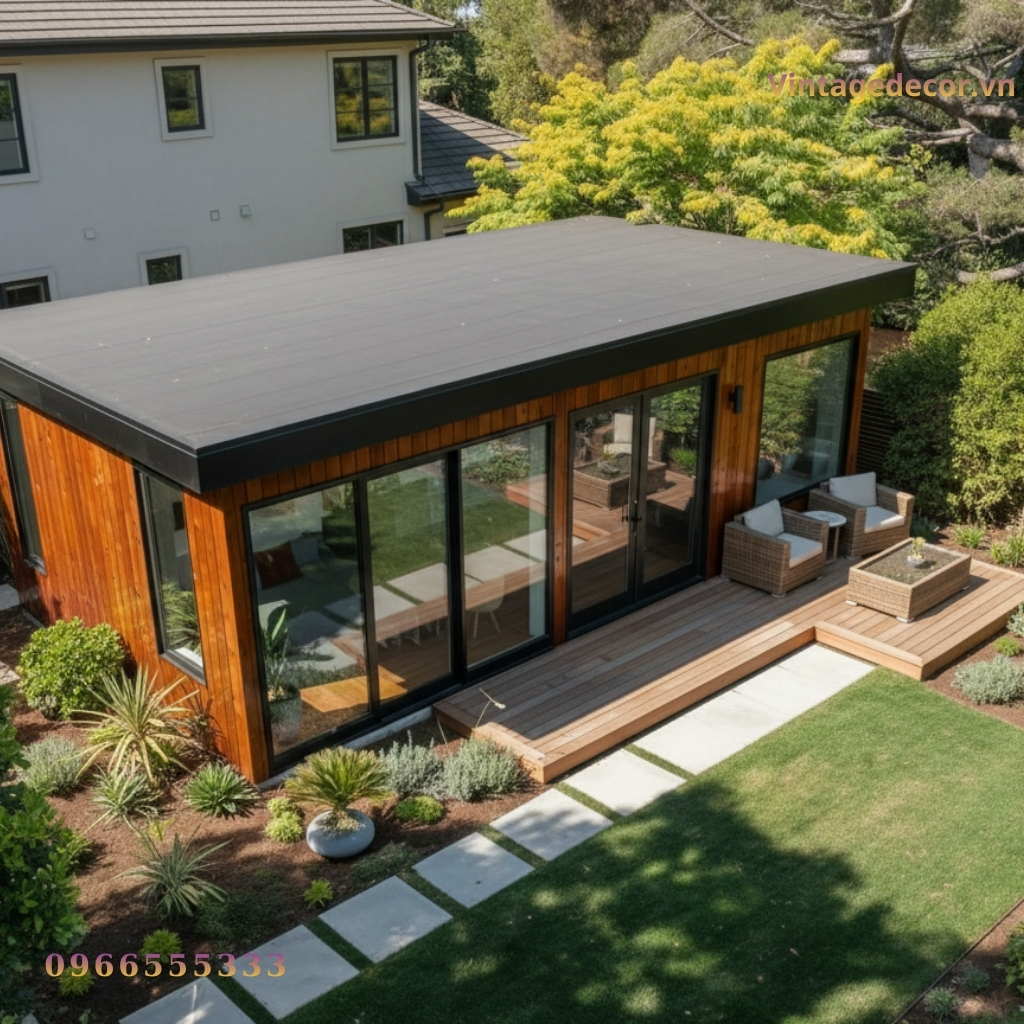 - Sàn gỗ ngoài trời (Decking): Phần hiên nhà được lát sàn gỗ chuyên dụng chịu nước, là nơi lý tưởng để bố trí bàn trà, ghế thư giãn, tạo nên một không gian “chill” đúng nghĩa.