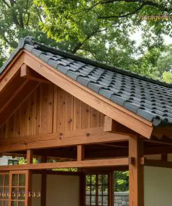 Nhìn vào tổng thể (như hình ảnh thực tế), mẫu J14 gây ấn tượng với phần mái được thiết kế dốc nhẹ hoặc vòm cong mềm mại, giúp thoát nước mưa tốt và tạo cảm giác che chở, ấm cúng. Phần hiên nhà (Engawa) được mở rộng – một nét đặc trưng của nhà Nhật, tạo không gian đệm để du khách ngồi thưởng trà, ngắm cảnh hay đọc sách vào mỗi sớm mai.