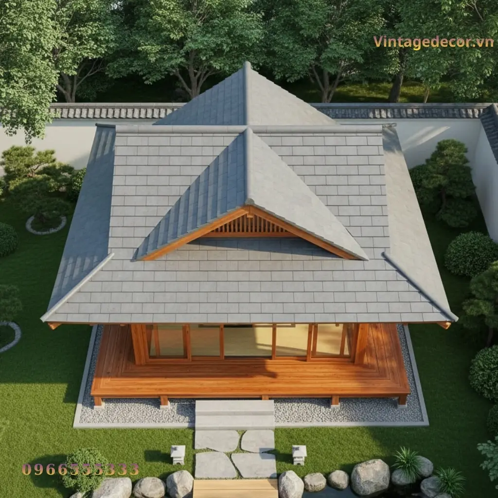 - Thiết kế mái dốc ấn tượng: Thừa hưởng nét đẹp của kiến trúc truyền thống Nhật Bản, phần mái dốc nhẹ không chỉ giúp thoát nước mưa hiệu quả, phù hợp khí hậu nhiệt đới gió mùa tại Việt Nam mà còn tạo nên tỉ lệ vàng cân đối cho tổng thể ngôi nhà.
