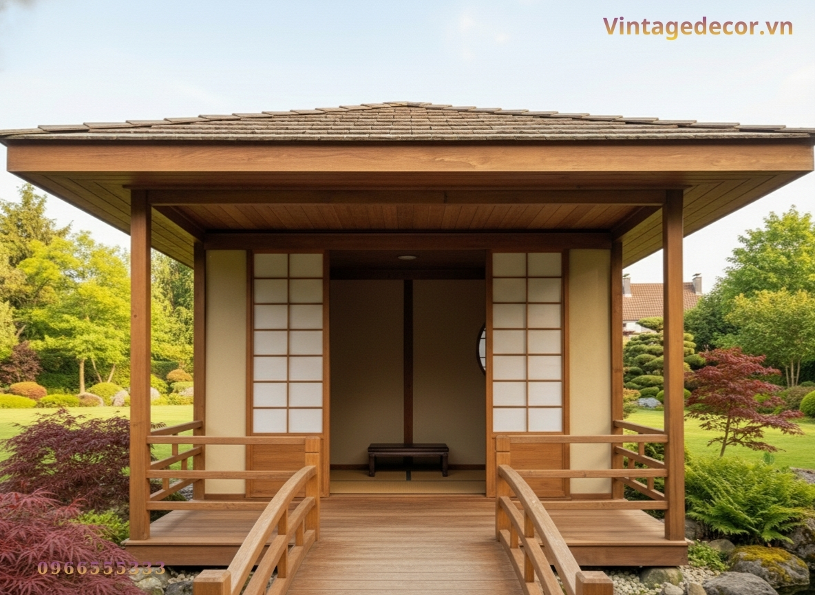 Tổng thể rất tối giản, tinh tế, đúng tinh thần nhà gỗ Nhật, nhưng vẫn gần gũi với không gian sân vườn Việt.