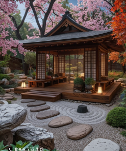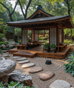 Trong khung hình là nhà gỗ Nhật Bản mái cong duyên dáng, sàn gỗ nâng cao, cửa trượt shoji đón gió, bao quanh là vườn cát vẽ vòng sóng và lối đá cuội stepping stone. Ánh nắng xuyên tán lá, cây bonsai và lớp sỏi mịn tạo nên cảm giác thiền định, yên ả – hoàn hảo cho uống trà, đọc sách hay thiền buổi sớm. Đây chính là tinh thần wabi-sabi tối giản, an nhiên của nhà gỗ Japan.