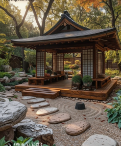 Hiên engawa + vườn khô: Sỏi – đá – tre – đèn lồng, cực “healing”.